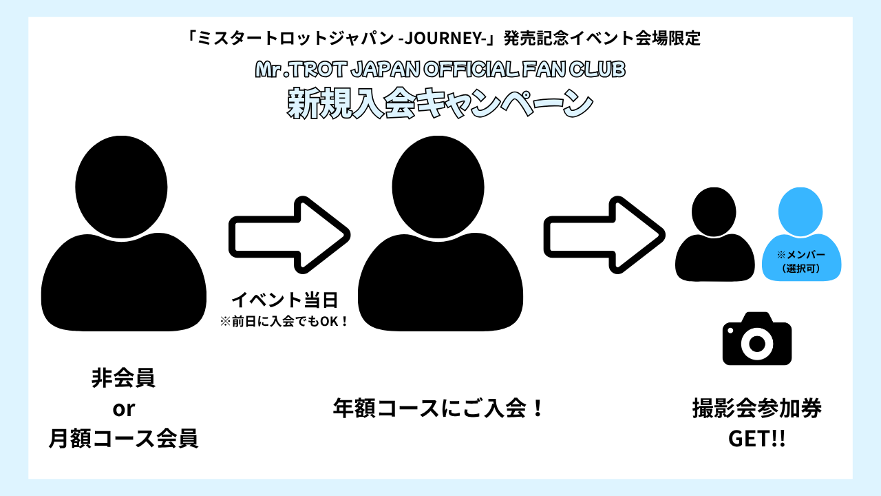 イベントの前日 or 当日に「Mr .TROT JAPAN OFFICIAL FAN CLUB」の年額コースに新規入会された方に「撮影会参加券」を1枚プレゼントいたします。