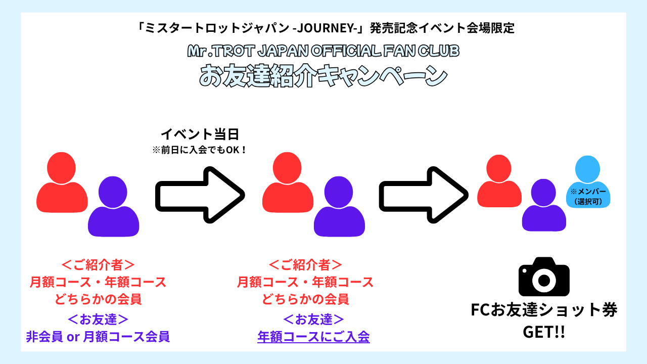 ・お友達:イベント前日 or 当日に「Mr .TROT JAPAN OFFICIAL FAN CLUB」の年額会員に新規入会され、紹介者とファンクラブブースにお越しいただいた⽅